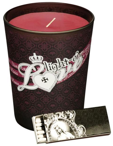양초 패키지 디자인에 믿음, 사랑, 소망의 상징이 장난스럽게 약간은 반항적인 느낌으로 통합되어 있다.